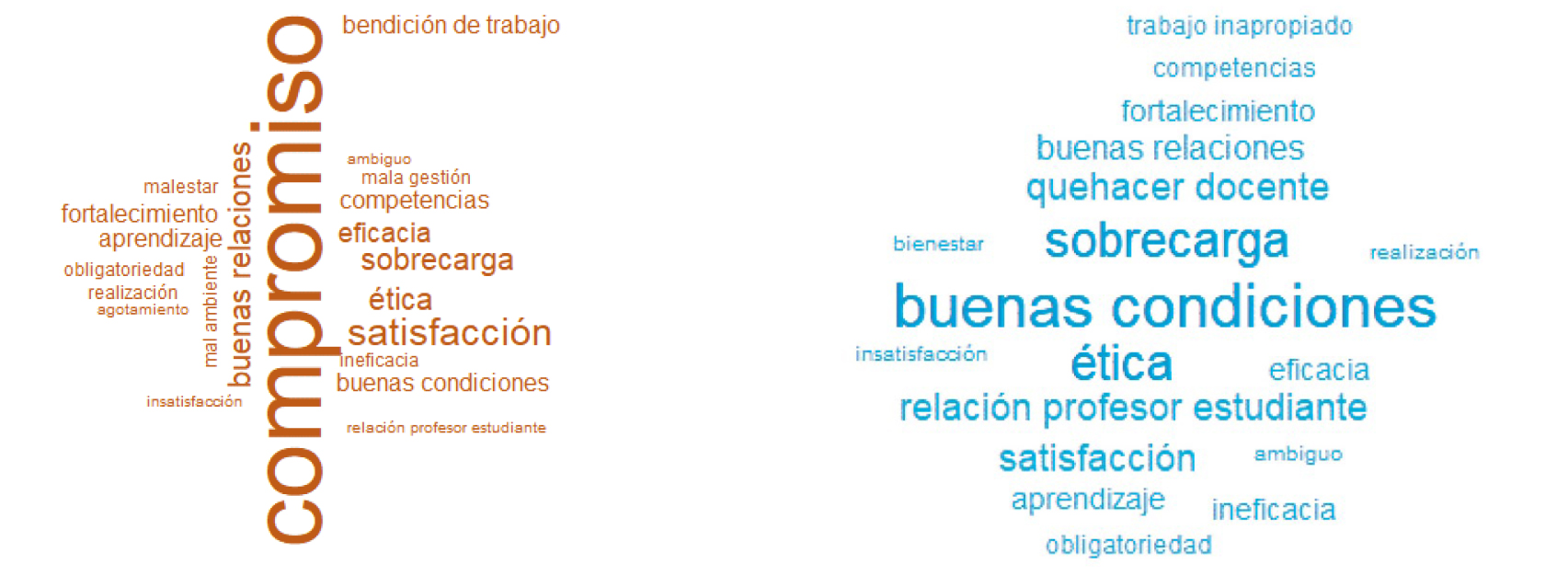 En el discurso de los profesores se observa la coocurrencia de categorías como compromiso, vocación académica y relación profesor-estudiante. Las expresiones de dichas categorías reflejan narraciones que implican la responsabilidad y el realizar una labor inspiradora. Sin embargo, de manera simultánea y ambivalente, también emergen categorías relacionadas con malas condiciones laborales, sobrecarga, agotamiento y mala gestión, las cuales evidencian un contexto de trabajo precario.