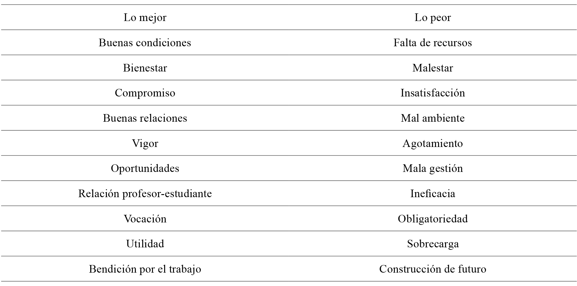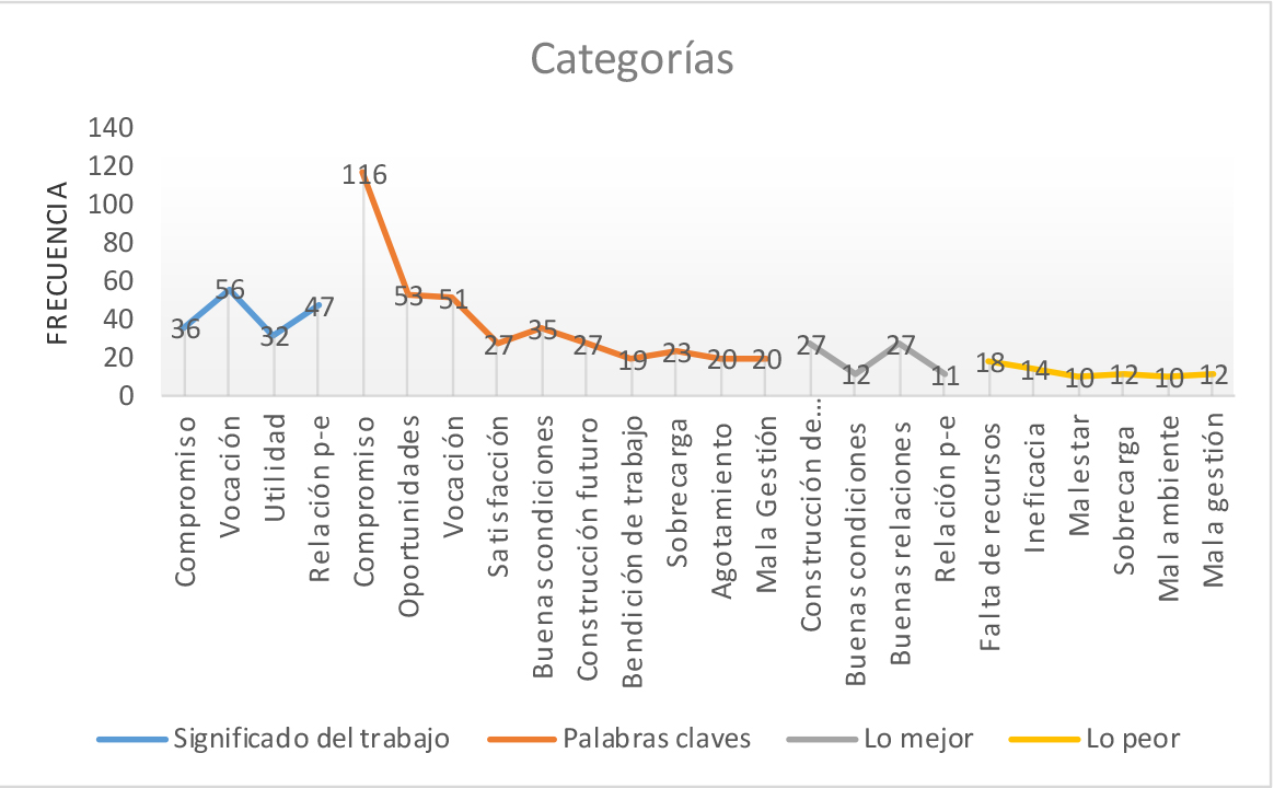 Al revisar la figura 2, se observa la frecuencia de categorías de palabras que dan sentido al trabajo docente y que se relacionan con lo mejor del trabajo en las tres preguntas realizadas —(1) el significado de trabajar, (2) cinco palabras clave asociadas al trabajo y (3) lo mejor y peor de su trabajo—, como buenas condiciones y relación profesor-estudiante. De igual manera, en las respuestas de lo peor del trabajo, los docentes mencionan categorías como mal ambiente, mala gestión, malestar, sobrecarga, falta de recursos, agotamiento y trabajo inapropiado (ver figura 2). Asimismo, reconocen aspectos de la experiencia del trabajo docente, referidos a la jornada de trabajo, la baja remuneración, la falta de recursos, los malos tratos recibidos por parte de estudiantes y padres de familia, y la desorganización institucional, como lo peor del trabajo.