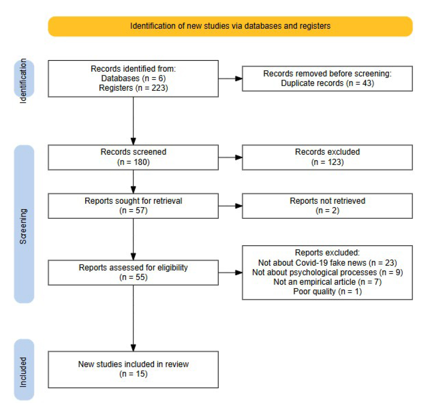 Two reviewers independently coded articles in an Excel matrix by author, sample, study design, data collection method, psychological process linked with acceptance of fake news (e.g., irrational beliefs may predict less Covid-19 preventive behaviors), interacting variables, and main findings.