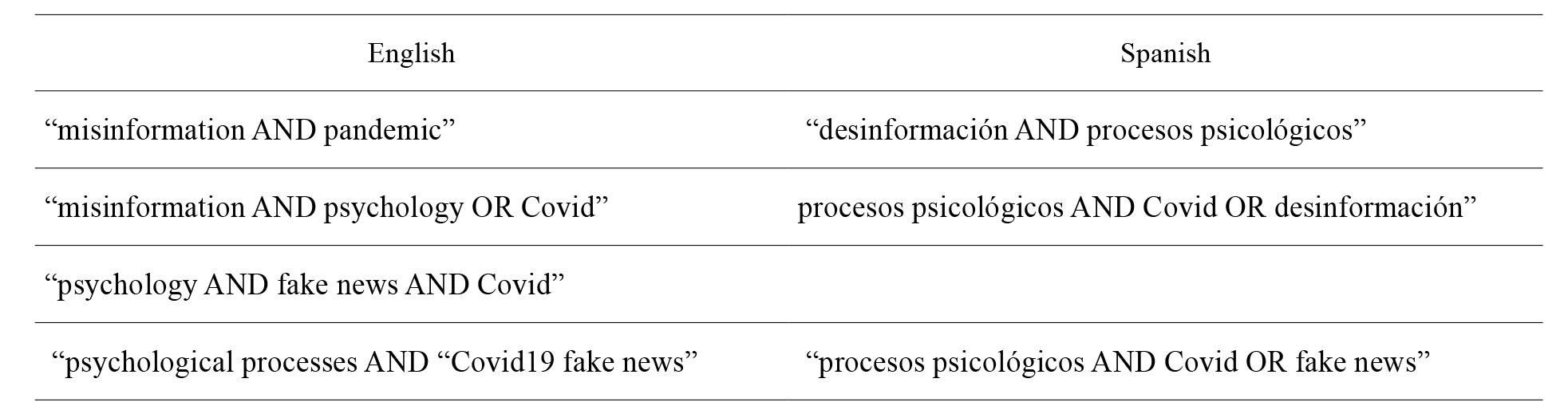 We conducted a PRISMA (Preferred Reporting Items for Systematic Reviews and Meta-Analyses) scoping review (Moher et al., 2015) of empirical literature on psychological processes associated with the acceptance of fake news regarding Covid 19, written in English and Spanish. First, we conducted a search on the following databases: Web of Science, Apa PsycInfo, ERIC, Psicodoc, Pubmed and Scopus. We searched to find relevant and potentially eligible studies realized between January-27-2020 and December-04-2022. Our search strategy aimed to combine key terms relevant to our objective. Although databases normally store key terms in the original language and in English, we conducted specific searches in Spanish considering the possibility that this is not always the case. Also, it should be noted that English and Spanish key terms are not necessarily direct translations. This is because of language variability in the use of vocabulary in relation to our goal (Table 1 shows the key terms used in our search).