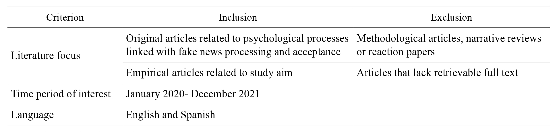 Note. Inclusion and exclusion criteria used: Literature focus, time, and language.