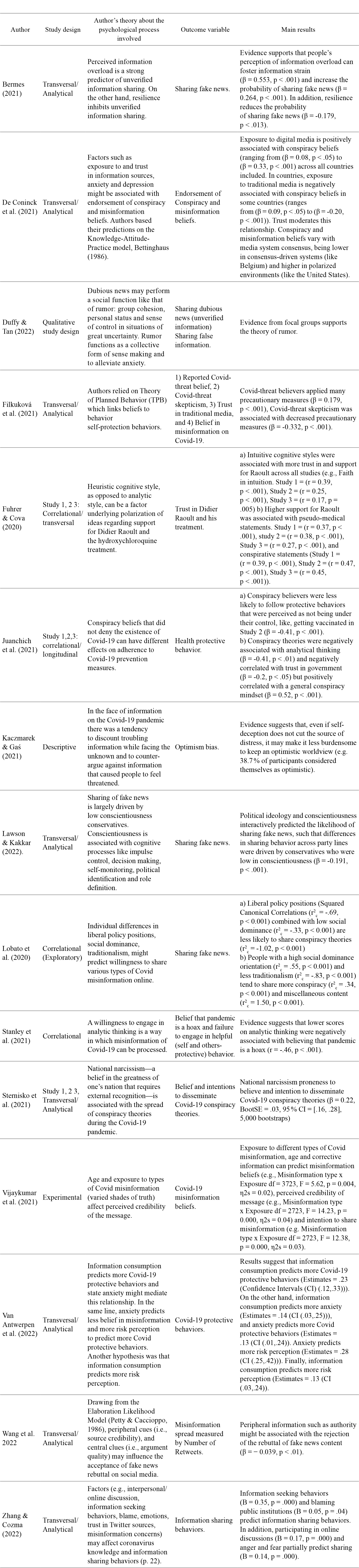 We will briefly describe the characteristics of the studies that are relevant to our goal. Also, we included a resume table (See Table 3) of authors, design, author's theory, dependent variable, and main results regarding psychological processes and acceptance of fake news.