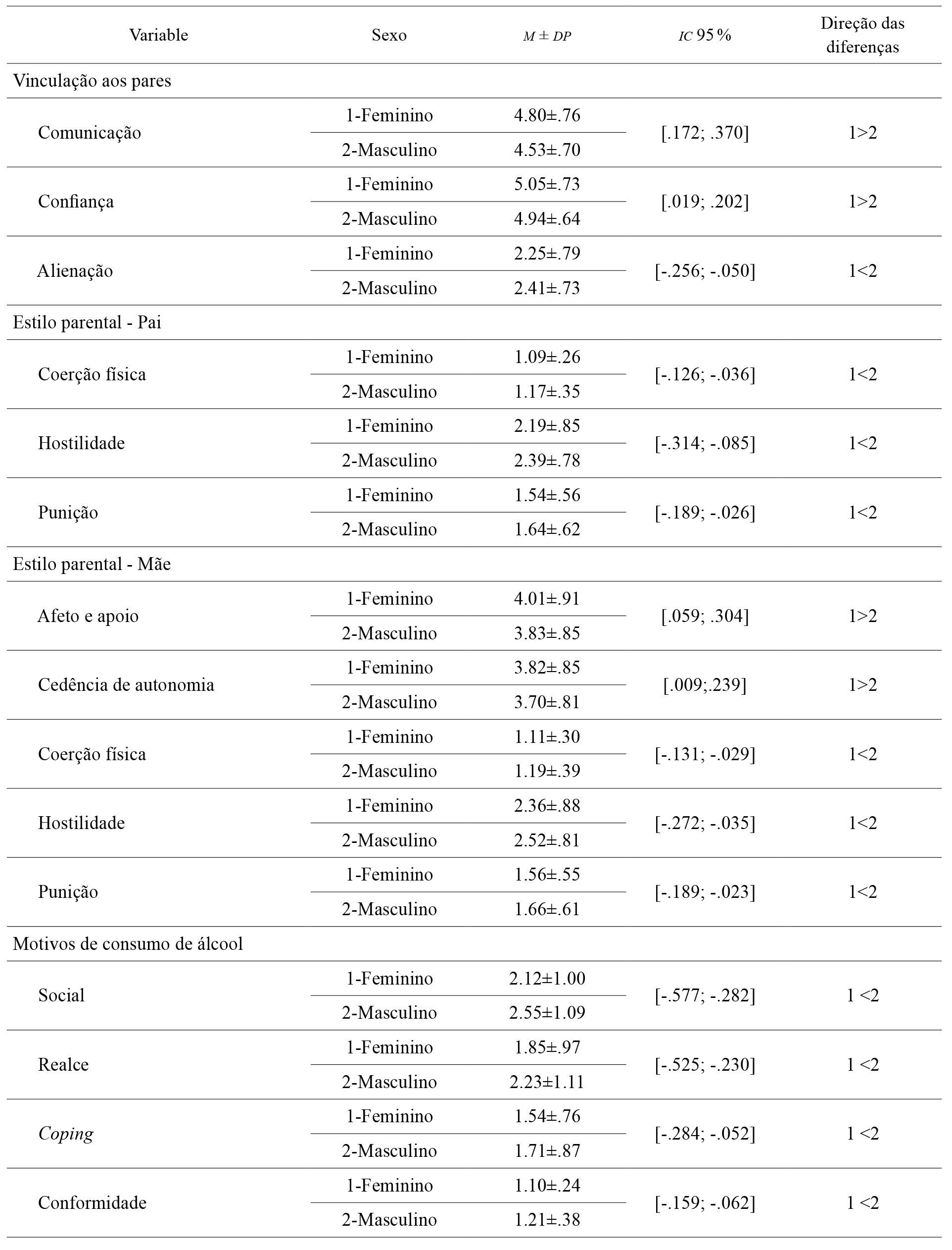 Tabela 1 Análise diferencial da vinculação aos pares, dos estilos parentais e dos motivos de consumo de álcool em função do sexo
