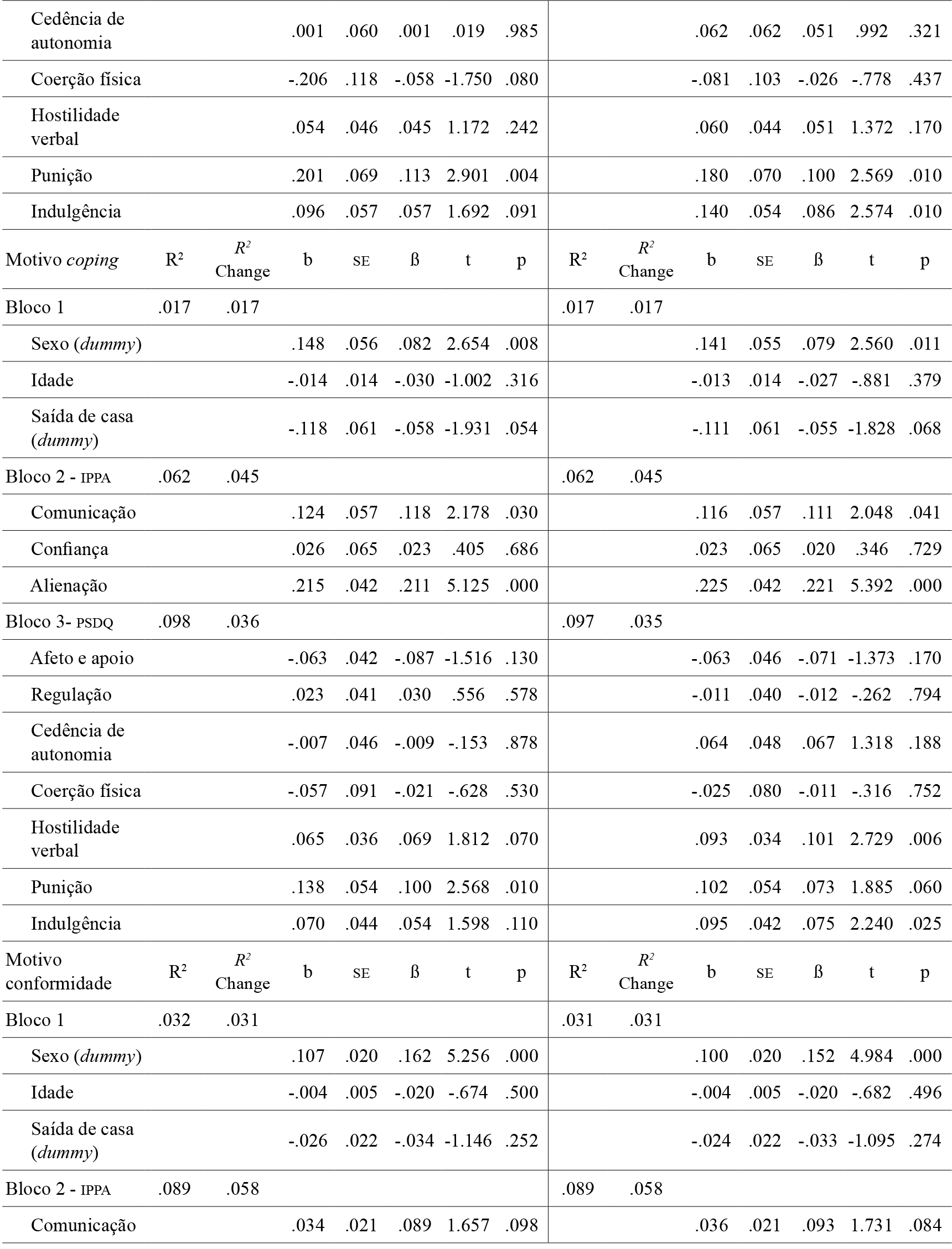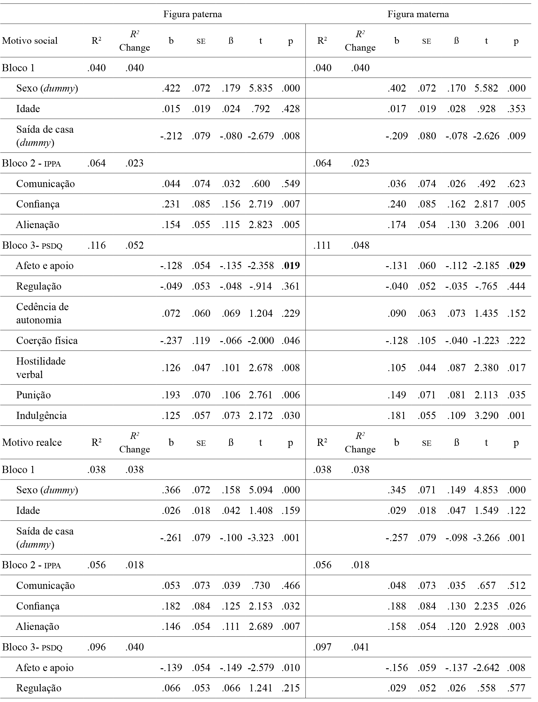 Procedeu-se à realização de análises de regressão múltipla hierárquica para avaliar o efeito preditor dos estilos parentais e da vinculação aos pares nos motivos de consumo de álcool. Foram realizadas análises independentes para pai e mãe, uma vez que existia controlo e perda de efeito quando da introdução das duas variáveis em simultâneo. Na análise de regressão múltipla face ao motivo de consumo de álcool social, verifica-se que no primeiro modelo (estilo parental paterno) nove variáveis apresentam uma contribuição significativa (p < .05) enquanto preditoras do motivo de consumo de álcool social, cuja a sua apresentação se encontra por ordem decrescente de importância: sexo (masculino) (β = .179), confiança (β = .156), afeto e apoio (β = -.135), alienação (β = .115), punição (fi = .106), hostilidade (fi = .101), saída de casa (β = -.080), indulgência (β = .073) e por fim coerção física (β = -.066). Relativamente ao segundo modelo (estilo parental materno), verificam-se oito variáveis com contribuição significativa enquanto preditoras do motivo social, encontrando-se as mesmas por ordem decrescente de importância: sexo (masculino) (β = .170), confiança (β = .162), alienação (β = .130), afeto e apoio (β = -.112), indulgência (β = .109), hostilidade (β = .087), punição (β = .081) e saída de casa (β = -.078) (Tabela 4).