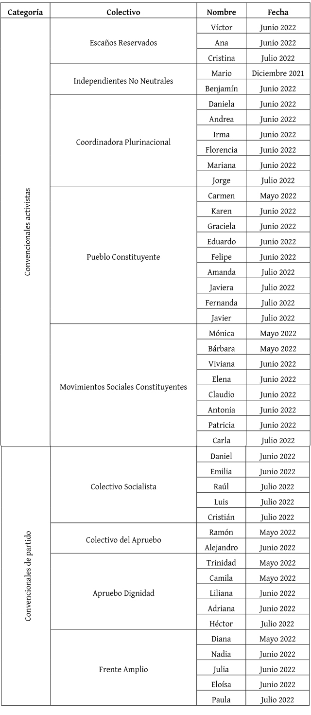 La tabla 1 reporta la lista de entrevistados por categoría y colectivo de pertenencia. Las entrevistas fueron realizadas bajo criterio de confidencialidad, por lo tanto, las referencias a los convencionales son anónimas y las citas incorporadas se identifican a través de un alias. Adicionalmente, la mayoría de las entrevistas utilizadas fueron realizadas entre mayo y agosto de 2022, es decir, mientras la Convención seguía en funciones y/o antes del plebiscito de salida del 4 de septiembre de 2022.