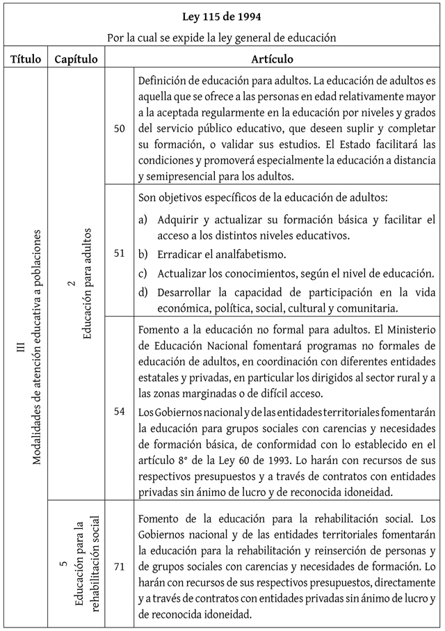La tabla 3 muestra los acápites de la Ley 115 de 1994 (ley general de educación) relacionados con inclusión educativa de víctimas y excombatientes. Se contempló la educación para adultos y la educación para la rehabilitación social, menciona la reinserción de personas que han atravesado carencias debido a su procedencia social.