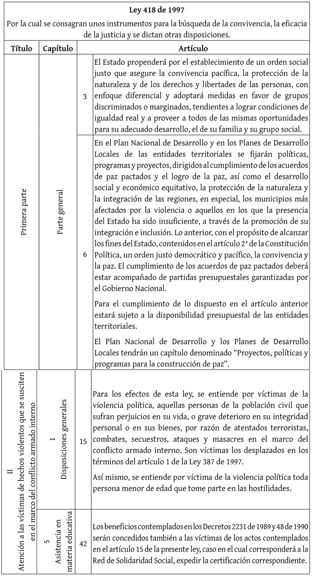 Ley 418 de 1997. Por la cual se consagran unos instrumentos para la búsqueda de la convivencia, la eficacia de la justicia y se dictan otras disposiciones. 26 de diciembre de 1997. D. O. N.° 43.201. https://www.funcionpublica.gov.co/eva/gestornormativo/norma.php?i=6372