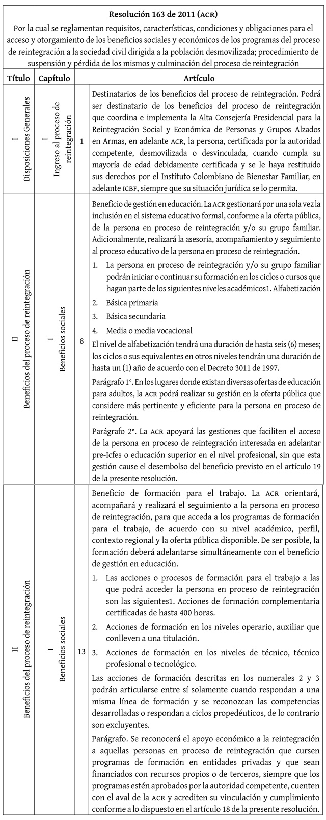 En el 2011 aparece la Resolución 163 de la ACR (tabla 5) y se sanciona la Ley 1448 de 2011 (tabla 6). La primera tiene por objeto reglamentar los requisitos, características, condiciones y obligaciones para acceder a los beneficios de los programas de reintegración a la sociedad civil. El título 2, capítulo 1, incluye la gestión en educación dentro de los beneficios sociales contemplados. La normativa hace hincapié en la educación primaria, básica y media. Sin embargo, en el parágrafo 2 del artículo 8, afirma que la ACR apoyará a la persona reinsertada que esté interesada en adelantar pre-Icfes o educación superior en un nivel profesional, aclarando que esto no necesariamente va a generar un desembolso.