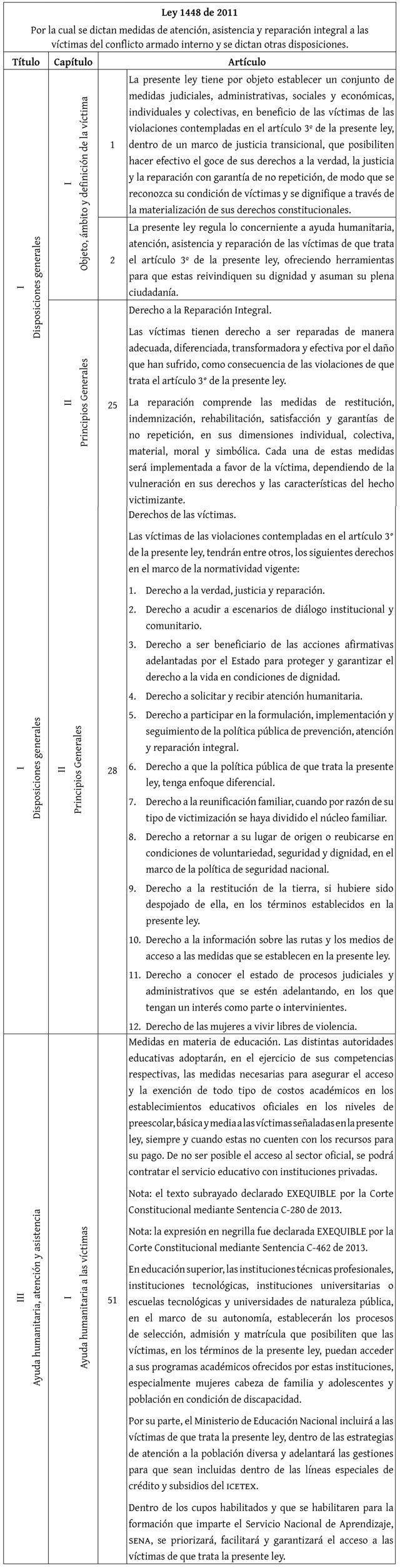 La Ley 1448 de 2011 (tabla 6), conocida como la ley de víctimas, dictamina las medidas de atención asistencia y reparación integral a las personas que han sido víctimas del conflicto armado. En el título I, capítulo 2, artículo 28, determina que, beneficiarse de las acciones afirmativas estipuladas por el Estado en pro de proteger y garantizar los derechos en condiciones de igualdad es un derecho de las víctimas. Así mismo, en el título III, capítulo I, artículo 51 menciona que, las íes de naturaleza pública deben establecer procesos de selección, admisión y matrícula a través de los cuales las personas en calidad de víctimas tengan facilidades para entrar a cursar estos programas (Ministerio del Interior, 2012).