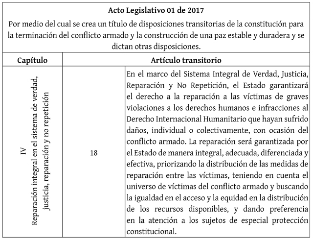 La tabla 7 muestra los acápites del Acto Legislativo 01 de 2017, que crea las disposiciones transitorias de la Constitución para la terminación del conflicto armado y la construcción de una paz estable y duradera. Se expone el artículo transitorio 18, donde se menciona que la reparación garantizada por el Estado debe darse de manera integral.