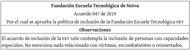 Acuerdo 047 de 2019 [Fundación Escuela Tecnológica de Neiva Jesús Oviedo Pérez]. Por el cual se aprueba la política de inclusión de la Fundación Escuela Tecnológica de Neiva Jesús Oviedo Pérez. Acta 108 del 18 de octubre de 2019. https://www.fet.edu.co/wp-content/uploads/2018/09/ACUERDO-047-DE-2019-INCLUSION.pdf