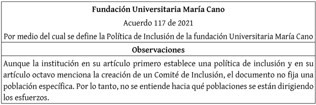 Acuerdo 117 de 2021 [Fundación Universitaria María Cano]. Por medio del cual se define la política de Inclusión de la Fundación Universitaria María Cano. 17 de agosto de 2021. https://www.fumc.edu.co/documentos/normatividadinst/actassuperior/117_2021.pdf
