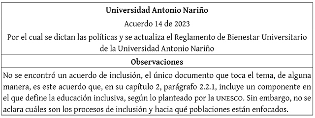 La tabla 11 muestra información sobre la Actualización del Reglamento de Bienestar Universitario de la UAN. No cuenta con acuerdo de inclusión y, entre la documentación revisada, solo se encontró un documento que hace referencia a la educación inclusiva. Sin embargo, no tiene ruta alguna o política que involucre de manera directa a las víctimas y excombatientes del conflicto armado.