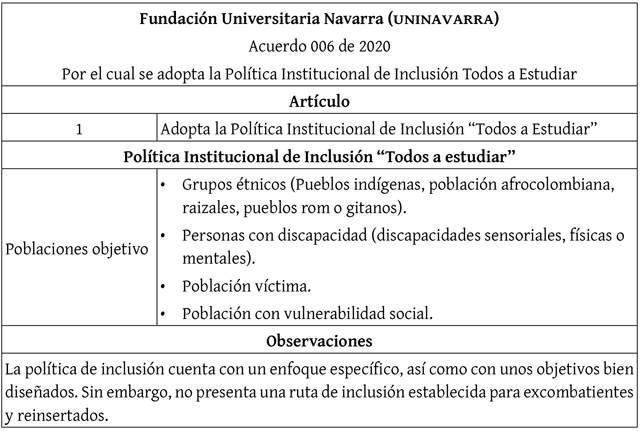 De la tabla 9 a la 12 muestran que, entre las demás IES, la única que cuenta con un acuerdo de inclusión dirigido a unos beneficiarios específicos es la UNINAVARRA, que contempla a grupos étnicos, personas con discapacidad, población víctima y población con vulnerabilidad social. Esta institución, por medio del Acuerdo 006 de 2020, adopta la Política Institucional de Inclusión "Todos a Estudiar". Este documento enumera unos objetivos destinados a la educación inclusiva, pero no es muy claro acerca del presupuesto ni cómo se va a llevar a cabo el proceso de las asistencias económicas y alimentarias. Las demás IES se quedan cortas en la definición de la población que buscan beneficiar con sus políticas de inclusión y no muestran una línea de acción clara.