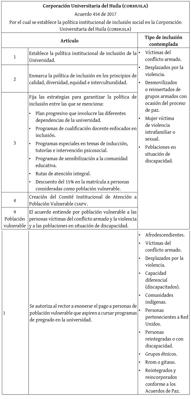 El acuerdo de inclusión de la CORHUÍLA (tabla 13) se dirige a víctimas del conflicto armado, desplazados por la violencia, desmovilizados o reinsertados de grupos armados, mujeres víctimas de violencia intrafamiliar o sexual y poblaciones en situación de discapacidad. Aunque el Acuerdo 454 de 2017 dispone que la matrícula de personas consideradas como población vulnerable debe tener un descuento del 15%; el Acuerdo 685 de 2021 autoriza al rector a exonerarlos del pago de matrícula y adhiere como beneficiarios a afrodescendientes, desplazados por la violencia, personas pertenecientes a la Red Unidos, grupos étnicos y pueblos gitanos.