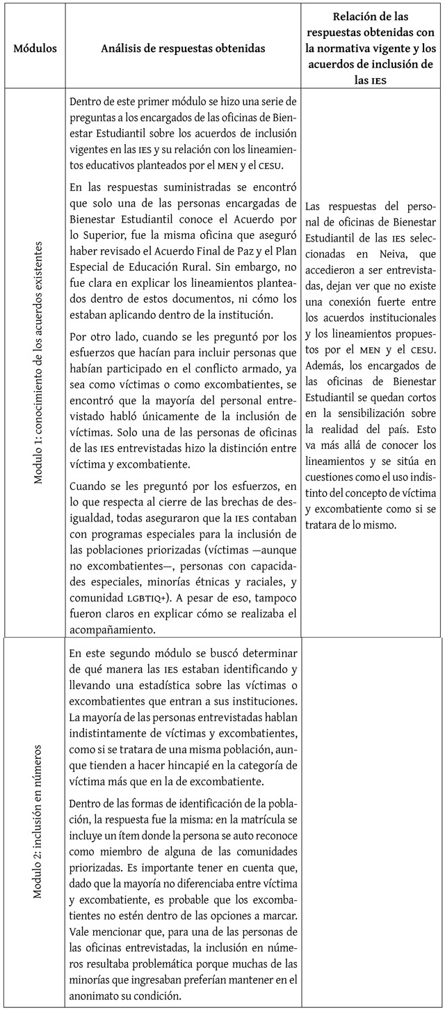 En la tabla 14 se hace un breve análisis de las respuestas obtenidas por parte del personal de las oficinas de Bienestar Estudiantil. Cabe resaltar que todas las personas entrevistadas aseguraron tener unos parámetros claros para la inclusión de las poblaciones priorizadas dentro de los lineamentos del MEN y del CESU (a pesar de que solo una dijo conocer dichos documentos); lo que no concuerda con lo encontrado en los acuerdos que, en su mayoría, son pobres y poco específicos. Sumado a esto, las respuestas obtenidas dejaron ver que el personal contratado para desempeñarse en estas dependencias no está preparado ni sensibilizado en el tema de inclusión de víctimas y excombatientes, lo que podría llevar a que en la práctica no existan esfuerzos tangibles por la reconstrucción del tejido social en las IES de la ciudad.