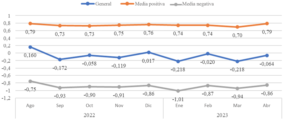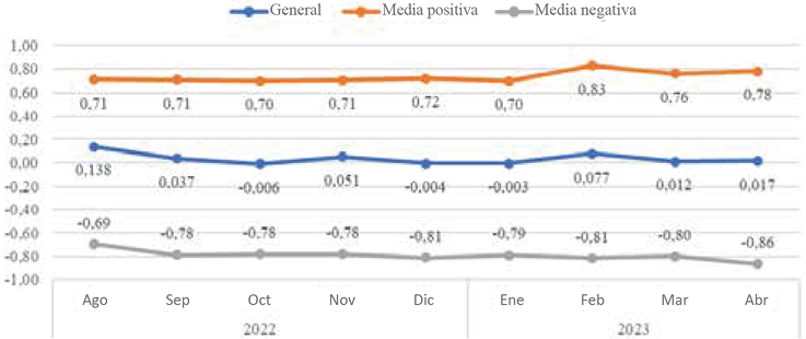 El resultado global de cada texto se alcanza mediante la suma de los valores obtenidos. Para obtener los resultados globales de los sentimientos latentes, se calculó la media total de los coeficientes logrados y se determinaron los porcentajes de los tuits con sentimientos positivos, negativos y neutros. Los tuits neutros son aquellos que no presentan un sentimiento claramente definido y se utilizan únicamente para informar sobre un tema en particular.