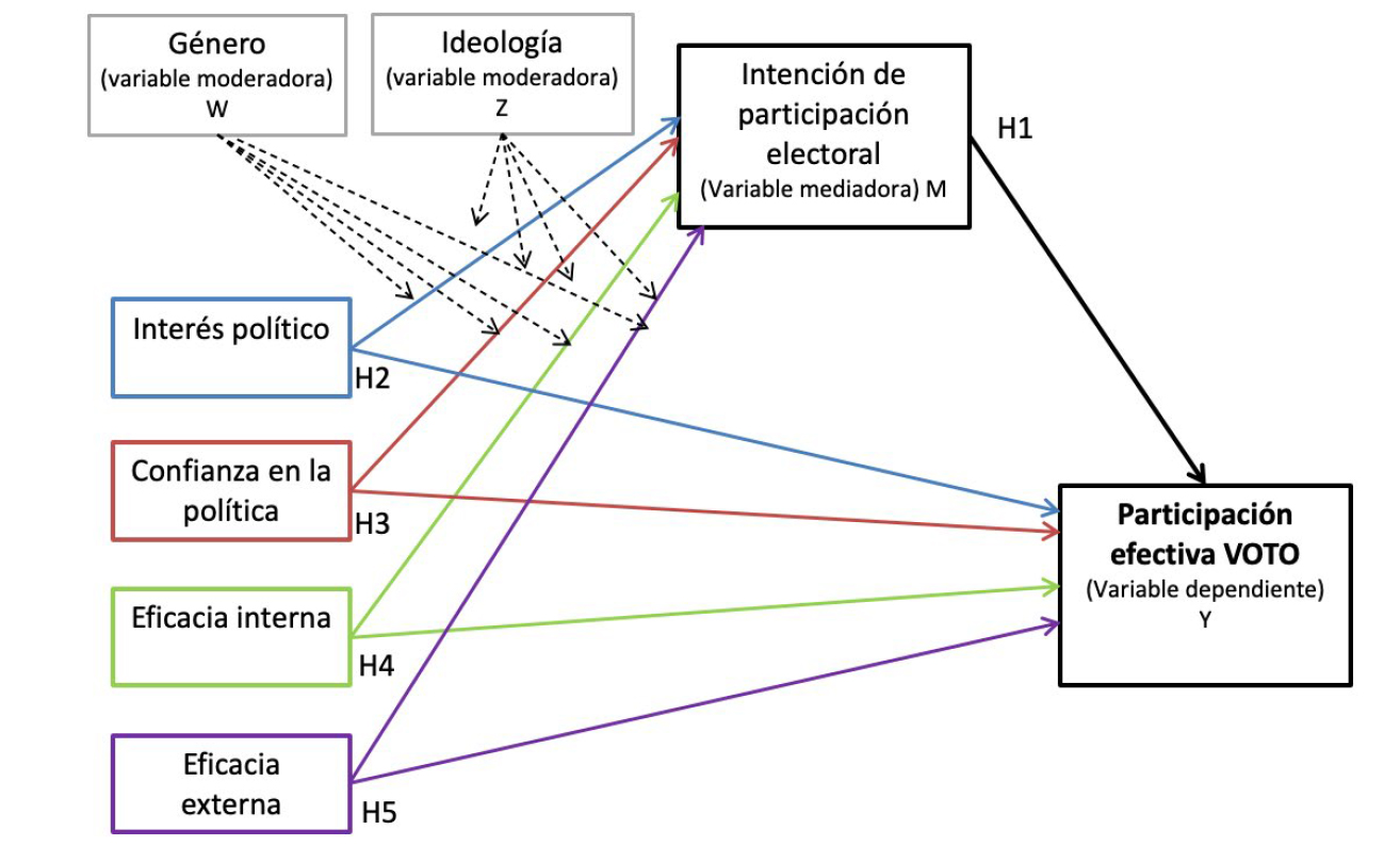 • H5: la percepción de la eficacia externa de la política ejerce una influencia directa positiva en la participación efectiva de los jóvenes, a la vez que tiene un efecto condicional indirecto positivo, mediado por la intención de participación y moderado por el género y la ideología.
