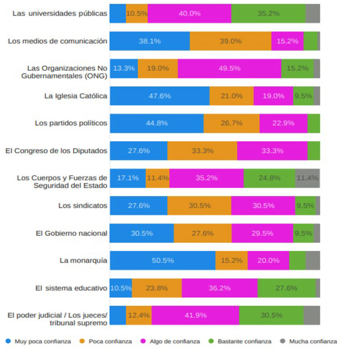 Entre los factores analizados de la desafección política, se ha constatado que uno de los que demuestra tener mayor efecto sobre la participación es la confianza, con un efecto directo sobre la intención de participación de los jóvenes. Tal como avanzaban Megías y Moreno (2022), la confianza ciudadana en los políticos es cada vez menor y muchos jóvenes no se sienten representados dentro de las instituciones públicas que ejercen la toma de decisiones (Espina, 2021). Desde el punto de vista de la confianza institucional, las que obtienen mejor resultado son las universidades públicas, seguidas del poder judicial, el sistema educativo y los Cuerpos y Fuerzas de Seguridad del Estado, mientras que las que menos confianza obtienen son la monarquía, la Iglesia Católica, los partidos políticos y los medios de comunicación. Con respecto a la confianza política, es más baja hacia los partidos políticos, el Gobierno y el Congreso de los Diputados, lo que evidencia que está alejada de otras generaciones (Sanz, 2022).