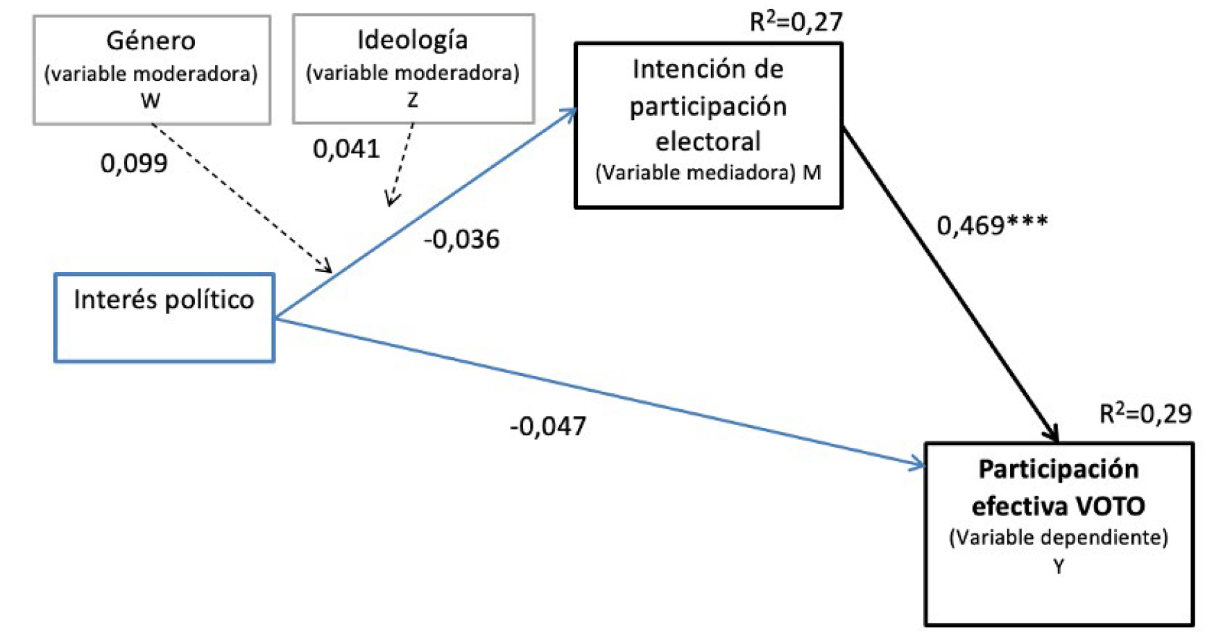 Desde este planteamiento, se ha propuesto un modelo de investigación que se compone de variables independientes (el interés político, la confianza, la eficacia interna y la eficacia externa), una variable dependiente (la participación efectiva, es decir, el voto) y una variable mediadora (la intención de participación electoral). Además, este modelo se nutre de dos variables moderadoras: el género y la ideología, aunque la mayoría de los efectos moderadores no resultan significativos estadísticamente. Las pruebas "t de Student" para muestras independientes señalan que no existen diferencias significativas entre la ideología de los hombres y de las mujeres. No obstante, se aprecian diferencias significativas en la participación electoral (voto) y en la intención de participación electoral (intención de voto), siendo más fuerte en las mujeres. Por otro lado, no se encuentran diferencias significativas entre hombres y mujeres en el interés, la confianza, la eficacia interna y externa.