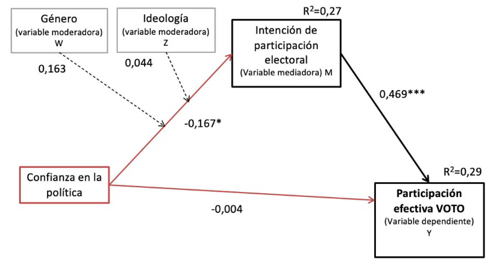 Por otro lado, la confianza ejerce un efecto directo positivo sobre la intención de participación electoral que es significativo (B = 0,167; t = 2,075; p = 0.038) y un efecto directo no relevante sobre la participación efectiva (B = -0,004; t = 0,052; p = 0,958). El efecto indirecto de la confianza sobre la participación efectiva (voto) mediado por la intención de voto no son trascendentales (B = 0,078). En cuanto a la moderación de género, el efecto indirecto de la moderación por género (B = -0,053) y por ideología (B = -0,006) sobre la participación efectiva tampoco han resultado significativos.