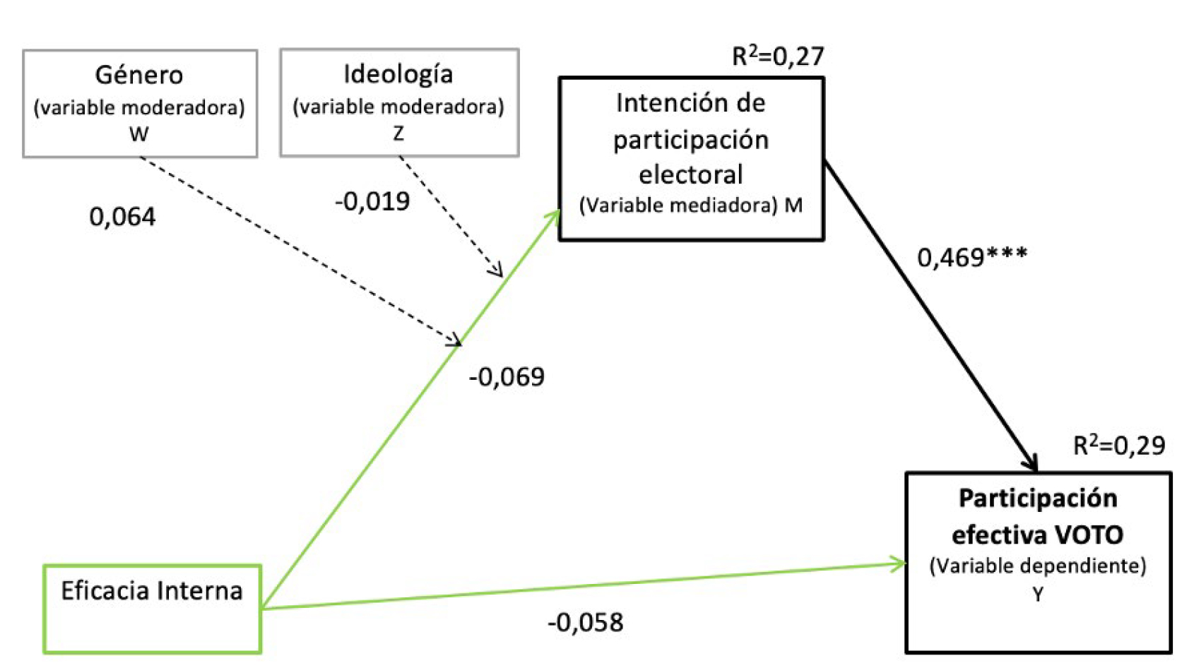 La percepción de eficacia interna ejerce un efecto directo negativo sobre la intención de participación electoral que no ha resultado significativo (B = -0,069; t = 0,833; p = 0,405) y un efecto directo negativo sobre la participación efectiva (voto) que tampoco es notable (B = -0,058; t = 0,816; p = 0,415). El efecto indirecto de la eficacia interna sobre la participación efectiva (voto) mediado por la intención de voto no ha resultado significativo (B = -0,032). En cuanto a la moderación, el efecto indirecto del género (B = -0,054) y de la ideología (B = -0,017) sobre la participación efectiva no han resultado significativos.