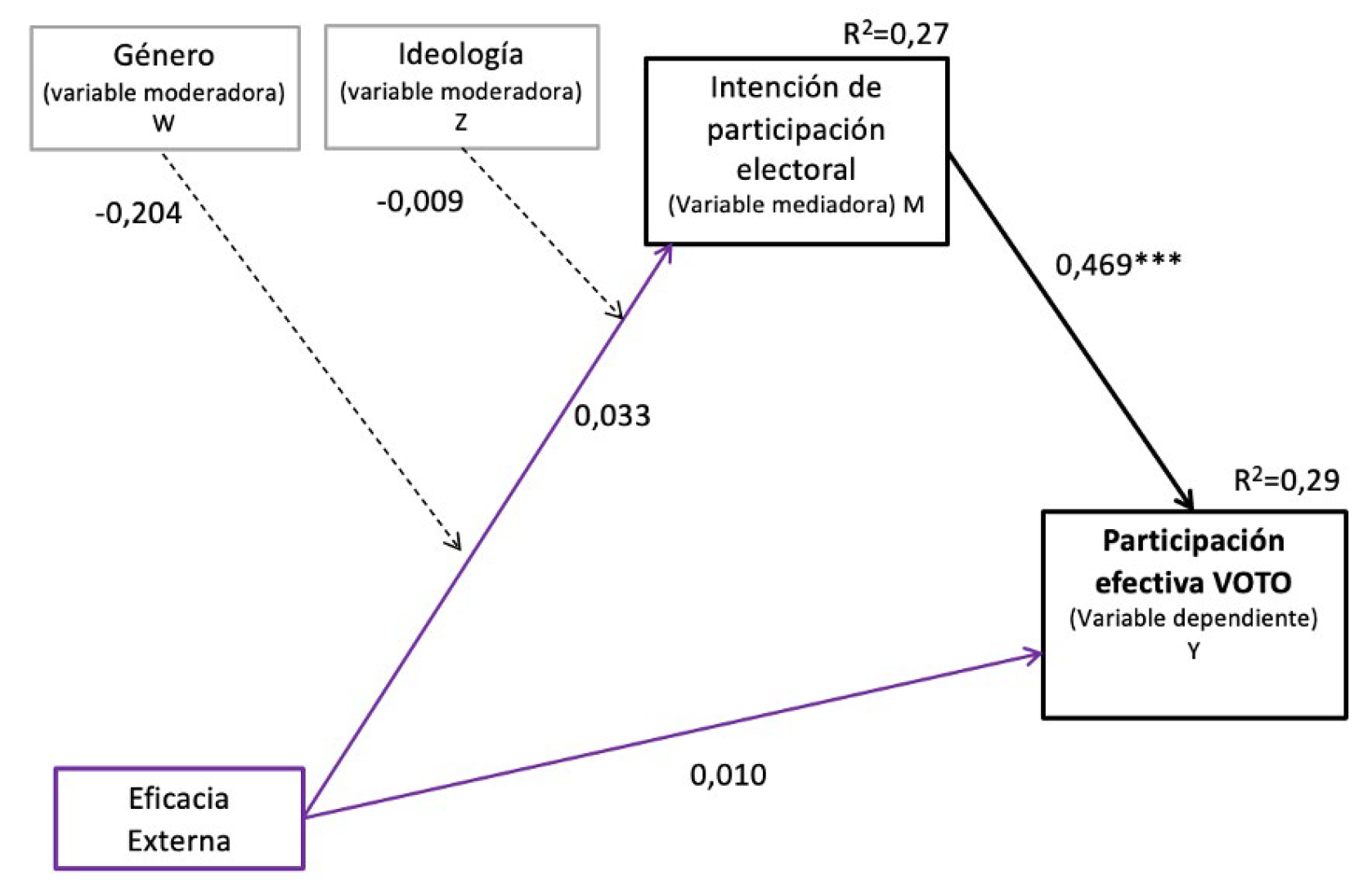 La percepción de eficacia externa ejerce un efecto directo positivo sobre la intención de participación electoral que no ha resultado significativo (B = 0,033; t = 0,540; p = 0,590). Por otro lado, la eficacia externa ejerce un efecto directo positivo sobre la participación efectiva (voto) que no es trascendente (B = 0,010; t = 0,113; p = 0,910). El efecto indirecto de la eficacia externa sobre la participación efectiva (voto) mediado por la intención de voto no ha resultado relevante (B = 0,016). En cuanto a la moderación, el efecto indirecto del género (B = -0,037) y de la ideología (B= -0,012) sobre la participación efectiva tampoco han resultado significativos.