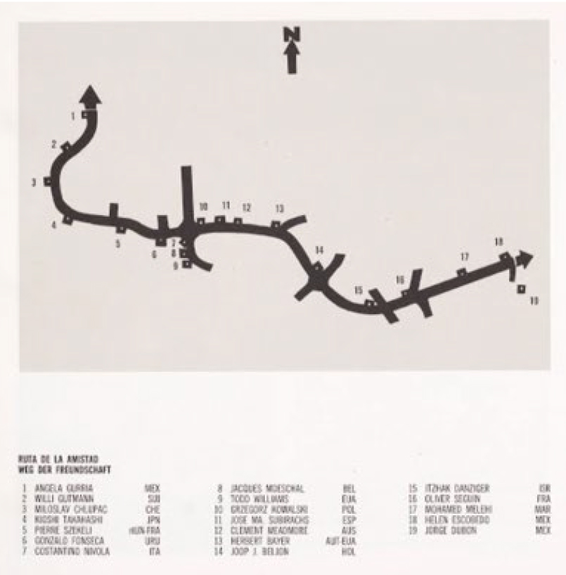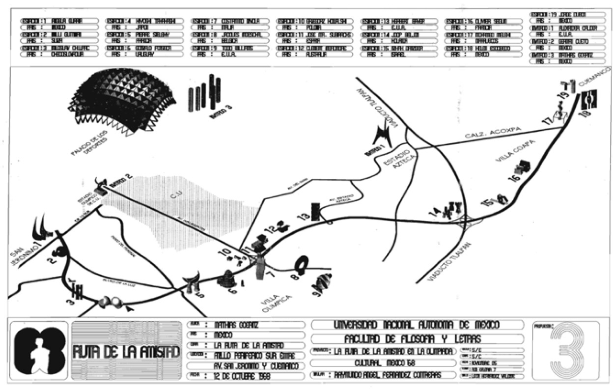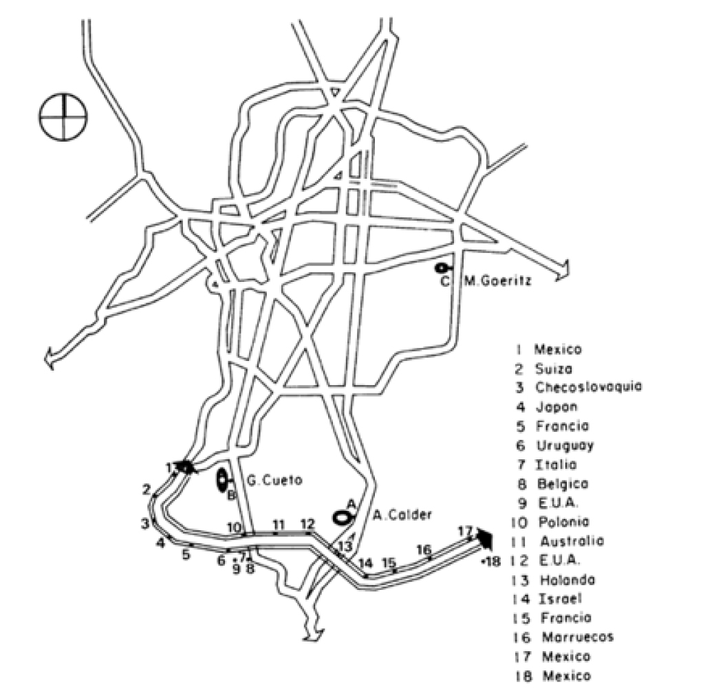 Fuente: "La Ruta de la Amistad", ubicada en la parte sur del Anillo Periférico, la carretera alrededor de la Ciudad de México, a ambos lados de la Villa Olímpica de 1968. Escala 1:300,000. (Goertiz, 1970).
