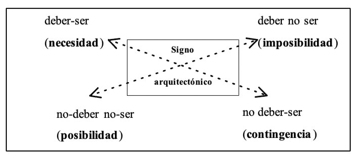 Las modalidades aléticas, como conceptos del ámbito de la lógica, tratan la verdad desde una perspectiva relativa, no absoluta. En otras palabras, plantean la verdad como una categoría lógica sujeta a contextos específicos. Este cuadro semiótico inicial establece una base teórica desde la cual podemos introducir cronotopos y matrices espaciotemporales (históricas), siguiendo a Abril (1997), para analizar el comportamiento y las características intrínsecas de los signos urbano-arquitectónicos.