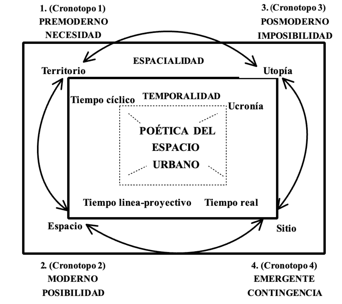 Cada una de estas matrices culturales y cronotopos se deriva al proyectar la categoría alética correspondiente en el signo espaciotemporal. De esta manera, la noción de tiempo cíclico-espacio territorio (cronotopo 1) se relaciona con un tiempo y espacio "necesario"; mientras que la noción de momento-espacio sitio (cronotopo 4) se asemeja a un tiempo y espacio "contingente". Del mismo modo, un tiempo lineal-espacio abstracto (cronotopo 2) se vincula con un tiempo y espacio de "posibilidad", y un tiempo ucrónico-espacio utópico (cronotopo 3) se asemeja a un tiempo y espacio de "imposibilidad". Además, estos cronotopos se traducen en matrices espaciotemporales que representan nociones culturales e históricas, categorizadas como premodernas, modernas, posmodernas y emergentes (ver figura 7).