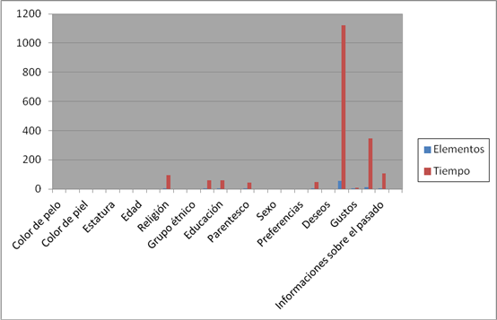 Asimismo, podemos observar que hubo categorías que no fueron si quiera mencionadas, como: color de pelo, nombre, color de piel, lugar de residencia, estatura, peso, edad, identidad sexual, títulos, grupo étnico, clase o estrato socio-cultural, hobbies, sexo, ocupación, preferencias, deseos y nombres de otras personas distintas del sujeto. En el Gráfico 16 y el Gráfico 17, vemos por separado es esfuerzo dedicado tanto a la producción de elementos como a la inversión de tiempo, respectivamente.
