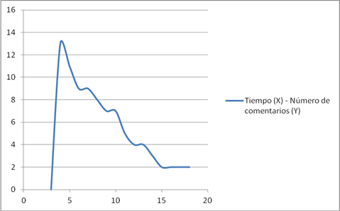 En el Gráfico 13 y el Gráfico 14 podemos ver la dispersión de los sujetos derivada de la relación elementos-comentarios y tiempo-comentarios, respectivamente. Vemos en cada uno de ellos, la imposibilidad de trazar una linea lo suficientemente inclinada como para representar una tendencia, pues si hiciéramos el intento tendríamos como resultado una línea vertical (en el caso del tiempo) y una línea ligeramente inclinada hacia la izquierda (en el caso del número de elementos) , lo que sugeriría una interpretación distinta a la que hemos venido haciendo. De hecho, si hacemos una lectura basándonos en esa imaginaria ligera inclinación hacía a la izquierda, podriamos pensar que, en el perfil del blog, los individuos que hablan más de sí mismos, son los menos comentados por álteres comunicativos; es decir, a menor número de comentarios, mayor esfuerzo comunicativo en la presentación del sí-mismo. Esta lectura cobraría sentido: (i) si la incliación hacia la izquierda fuera lo suficientemente marcada en ambos casos (elementos y tiempo); y (ii) si diéramos por sentado que la alta producción identitaria que tienen los sujetos con menos comentarios se debe a la ejecución de un esfuerzo adicional por parte de estos individuos para mostrar más de sí mismos y atrapar a “el-otro”, es decir, persudadir a los posibles lectores de su blog a comenzar una relación o virtual.