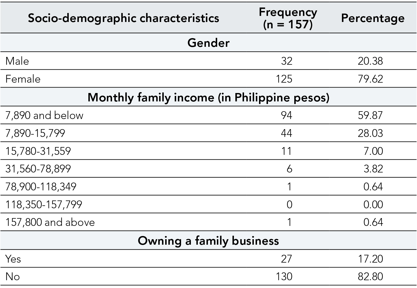 Table 1 presents respondents' socio-demographic profile details, including gender distribution, income, and having a family business. The gender distribution is mostly female (79.62 %) compared to male (20.38 %). Concerning monthly family income, most respondents (59.87 %) fall within the 7,890 and below Philippine pesos category and are typically low-income earners. At the same time, only a small percentage indicated higher income. Moreover, a minority of respondents (17.20 %) indicated owning a family business, while the majority (82.80 %) did not.