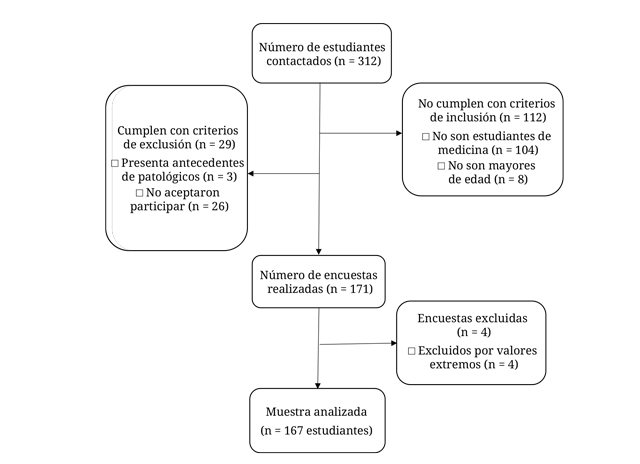 Se contactaron a 312 estudiantes de medicina, y de acuerdo con el cumplimiento de los criterios de selección, se encuestó a 167 estudiantes de medicina (figura 1), de los cuales el 60.5 °% (n = 101) eran mujeres y el 39.9 °% (n = 66) eran hombres. La mediana de edad fue de 21 años, con un rango intercuartílico de 18 a 27 años. En cuanto al ciclo universitario, la mediana fue de 6, con un rango intercuartílico de 4 a 10.