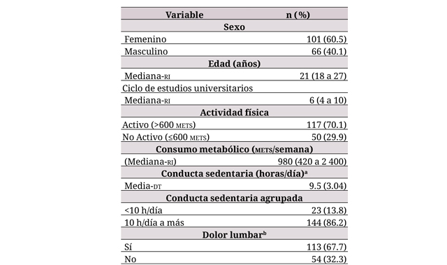 El 67.7% (n = 113) de los estudiantes informó haber experimentado dolor lumbar en los últimos 12 meses; mientras que el 32.3% (n = 54) no lo hizo. La conducta sedentaria, medida con el gpaq, mostró una media de 9.5 horas por día, con una desviación típica de 3.04.