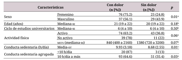 riesgo. El objetivo del estudio fue evaluar la asociación entre la presencia de dl en los últimos 12 meses y la conducta sedentaria en estudiantes de medicina de una universidad