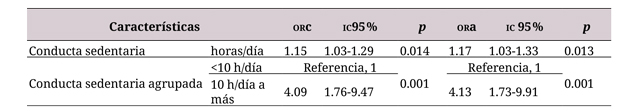 Además, cuando se comparó la conducta sedentaria según el punto de corte de 10 horas, aquellos que informaron 10 o más horas presentaron un ORC de 4.09 (IC95% = 1.76-9.47) y un ora de 4.13 (IC95% = 1.73 - 9.91), en comparación con la categoría de referencia de menos de 10 horas (p = 0.001), según se resume en la tabla 3.