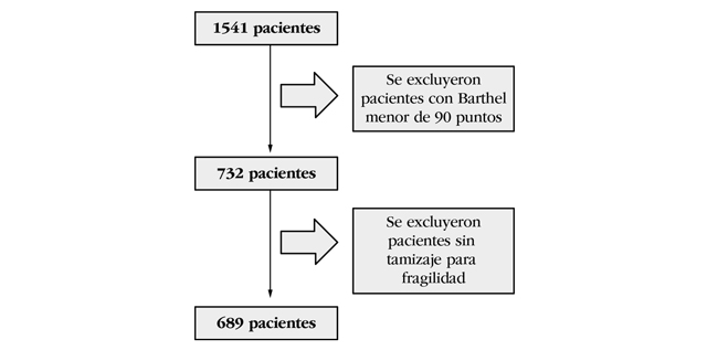 El análisis incluyó una muestra de 689 pacientes, del total de pacientes incluidos en la base de datos del Servicio de Consulta Externa del HUSI entre agosto 2016 y marzo de 2020. Los criterios de inclusión fueron tener 65 o más años (ya que esta es la edad mínima para la atención en el mencionado servicio de consulta externa) o menores de 65 años que padecieran de algún síndrome geriátrico. Se excluyeron aquellos pacientes con algún grado de dependencia para las actividades básicas de la vida diaria, medida por un puntaje en la Escala de Barthel menor a 90 puntos, y también aquellos con datos incompletos o en quienes no se hubiera hecho tamizaje para fragilidad. El proceso de selección, de acuerdo con los criterios de exclusión, se resume en la figura 1. El estudio fue aprobado por el Comité de Investigación y Ética del HUSI y de la Pontificia Universidad Javeriana.