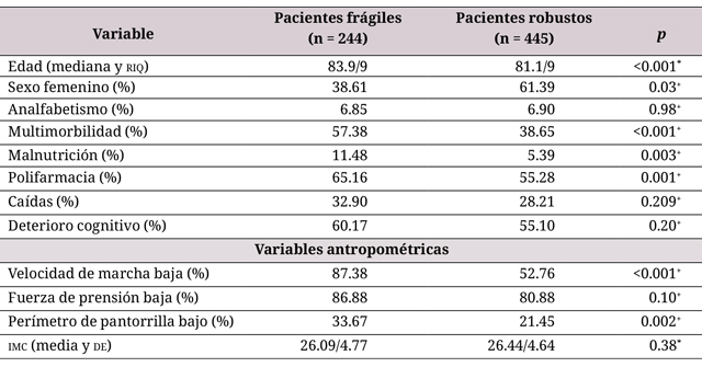 En total se estudiaron 689 pacientes, entre los cuales se encontró una prevalencia de fragilidad del 35.40 °%. Los participantes tenían una media de edad de 83.9 años (RIQ = 9) en el caso de pacientes con fragilidad, y de 81.1 años (RIQ = 9) para pacientes robustos (p < 0.001). El porcentaje de mujeres participantes con fragilidad fue del 38.61 %, y sin fragilidad, del 61.39 % (p = 0.03).