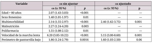 Nota. Al ajustar el análisis por las variables de desempeño, se encontró una asociación estadísticamente significativa de fragilidad con multimorbilidad (OR = 2.46; ic95 % = 1.62-3.75; p = 0.001), velocidad de la marcha lenta (OR = 5.15; IC95 % = 3.0-8.60; p = 0.001) y perímetro de pantorrilla bajo (OR = 1.60; IC95 % = 1.03-2.50; p = 0.06).