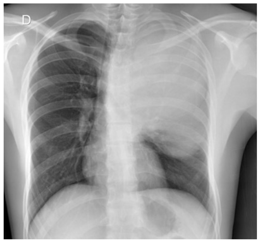 El caso corresponde a un hombre de 38 años de edad, sin antecedentes de importancia, cuyo padecimiento inició dos meses antes, con astenia, adinamia y fatiga, que dificultaba actividades de la vida cotidiana, además de tos seca y disnea de grandes esfuerzos. Acudió a atención médica y se le indicó tratamiento sintomático, pero no hubo mejoría. Diez días después, tuvo tos en accesos y la disnea se fue incrementando progresivamente hasta incluso aparecer en reposo. Se le indicó manejo sintomático, pero tampoco mejoró el cuadro clínico. Se le solicitó, entonces una radiografía de tórax, en la cual se observó una lesión pulmonar ocupativa en lóbulo superior izquierdo (figura 1).
