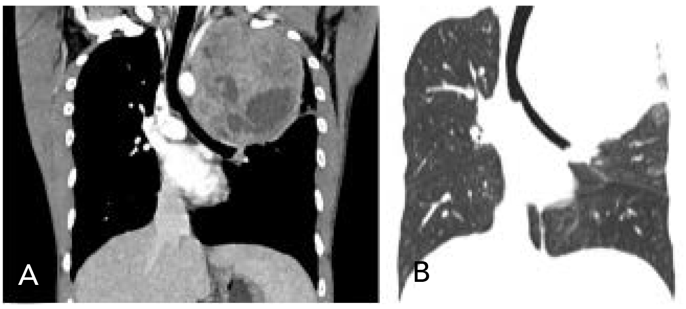 Figura 3. Tomografía contrastada, en reconstrucción coronal. A) Masa heterogénea en el pulmón izquierdo que desplaza la tráquea en sentido contralateral. B) Ventana pulmonar