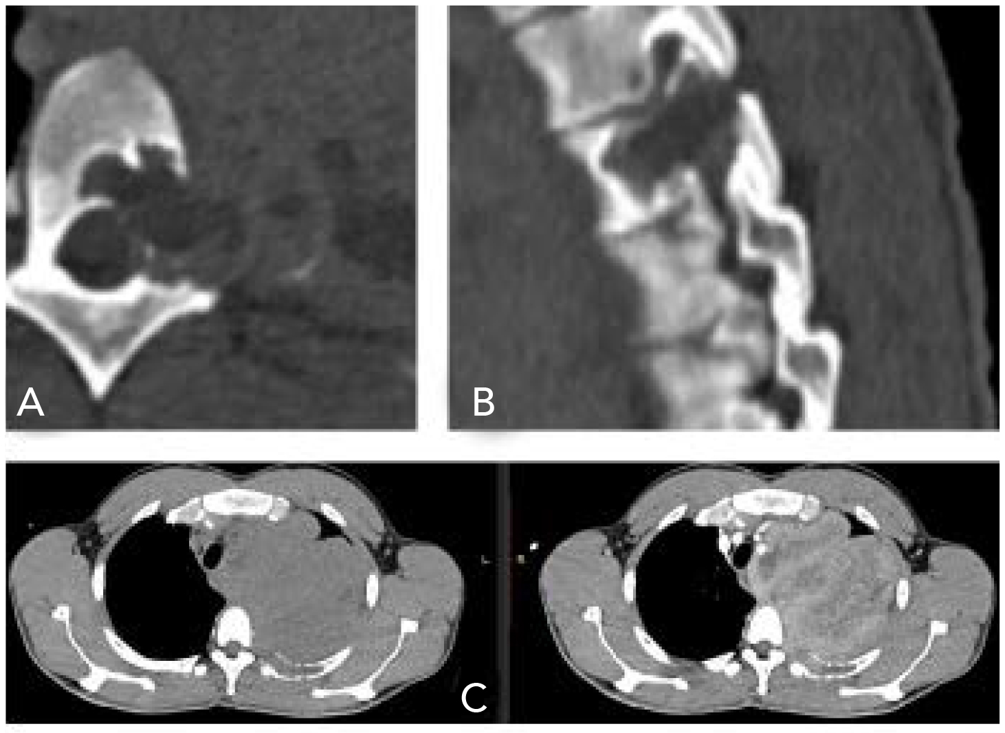 Figura 4. A) Corte axial a la altura de T4. B) Corte sagital T3-T5. C) Reconstrucción de corte transversal a la altura de T3