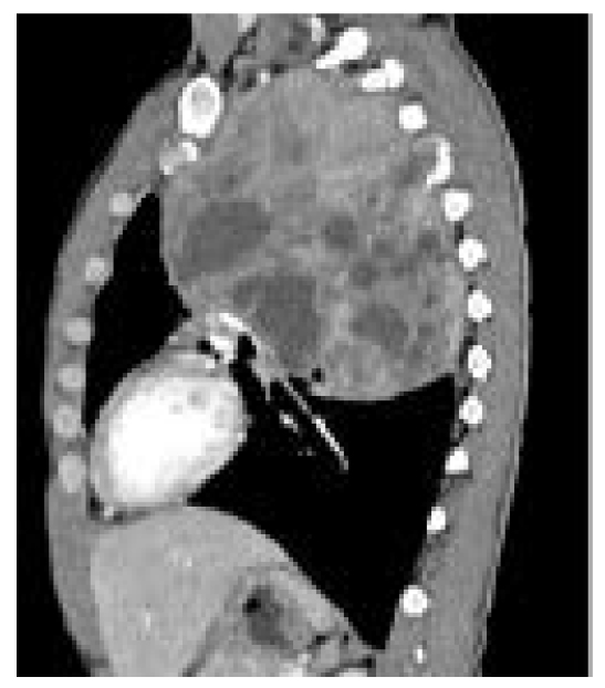 Después de ello se le tomó al paciente una tomografía contrastada que, en el plano axial, en el hemitórax izquierdo, mostró una tumoración que involucraba los segmentos apicoposterior y anterior del lóbulo superior y el segmento apical del lóbulo inferior. Medía aproximadamente 10.9 cm x 12.3 cm x 14.4 cm en sentido latero-lateral, anteroposterior y cefalocaudal, con densidad heterogénea (figura 2). Se observaron áreas sólidas que realzaban tras la administración de medio de contraste intravenoso, con zonas de necrosis de predominio en la mitad inferior. Los bordes eran lobulados e infiltraba la grasa mediastinal. En el corte coronal, se visualizó un efecto masa que desplazaba la tráquea, la carina y los bronquios, en sentido contralateral (figuras 3A y 3B).
