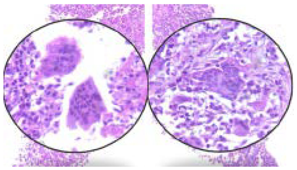 Figura 6. Fragmentos TRU-CUT referidos como biopsia pulmonar, en la que se observa una neoplasia de alta celularidad compuesta por células estromales tipo monocito de citoplasma eosinófilo moderado, núcleo ovoide basófilo con nucleolo discreto y por células gigantes tipo osteoclasto en las que se cuentan de 40 a 60 núcleos por célula. Sin evidencia de parénquima pulmonar residual ni mucosa bronquial. Sin evidencia de mitosis, atipia o necrosis