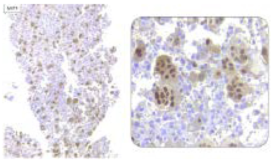 Figura 8. Factor de transcripción de microftalmia (MiTF): positivo en los núcleos de las células gigantes multinucleadas