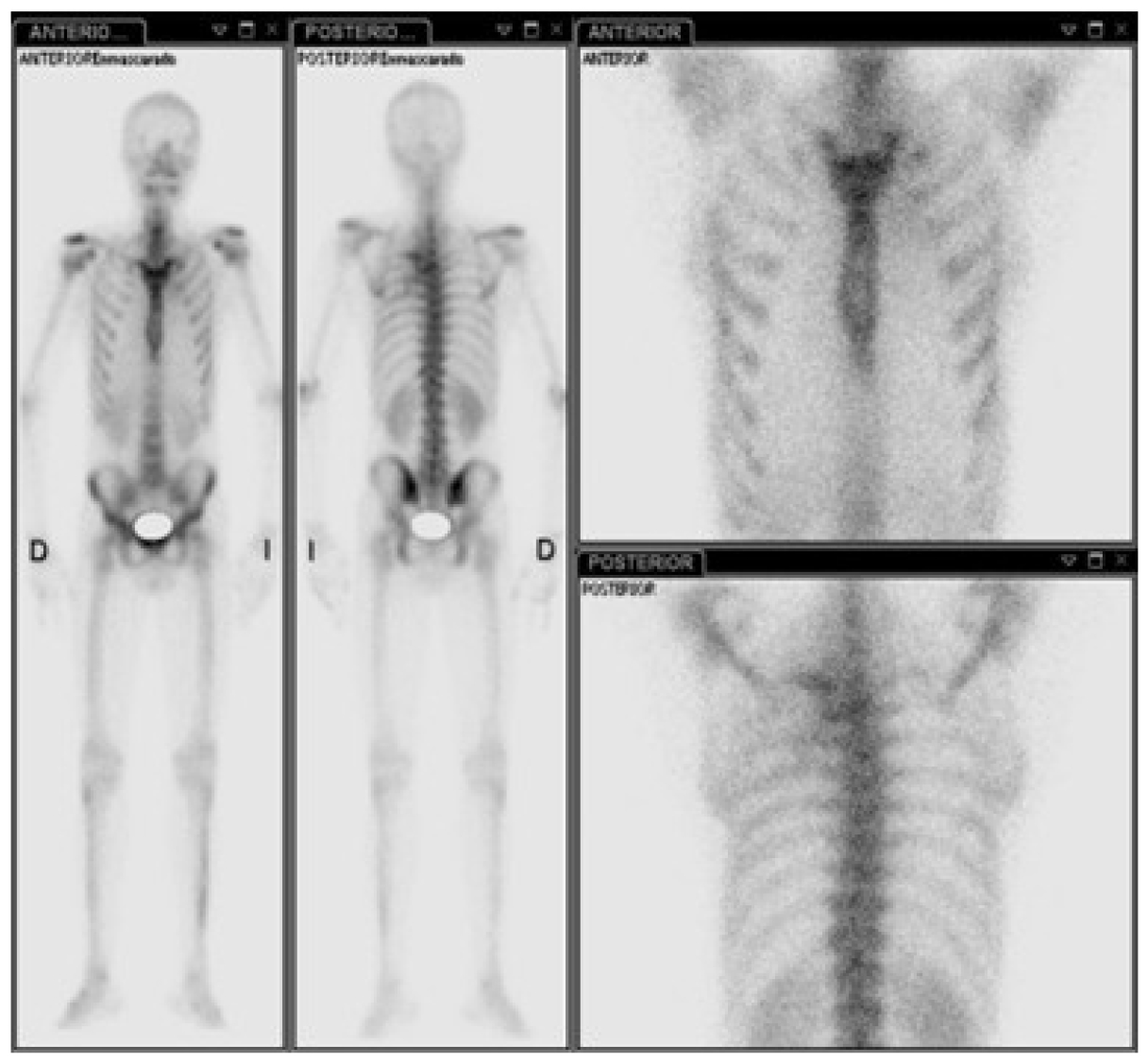 Para completar el abordaje, se le realizó al paciente una gammagrafía ósea que evidenció un tumor dependiente de vértebras torácicas que infiltraba el pulmón izquierdo y se introducía en el foramen vertebral de D3-D4, D4-D5, además de metástasis en los arcos costales cuarto y quinto izquierdos (figura 10).