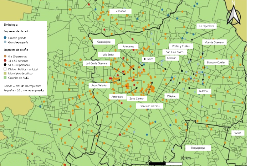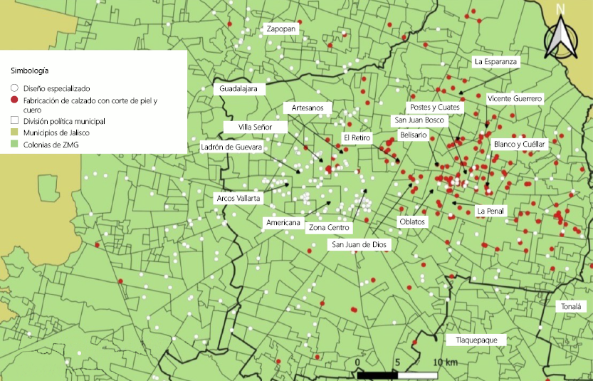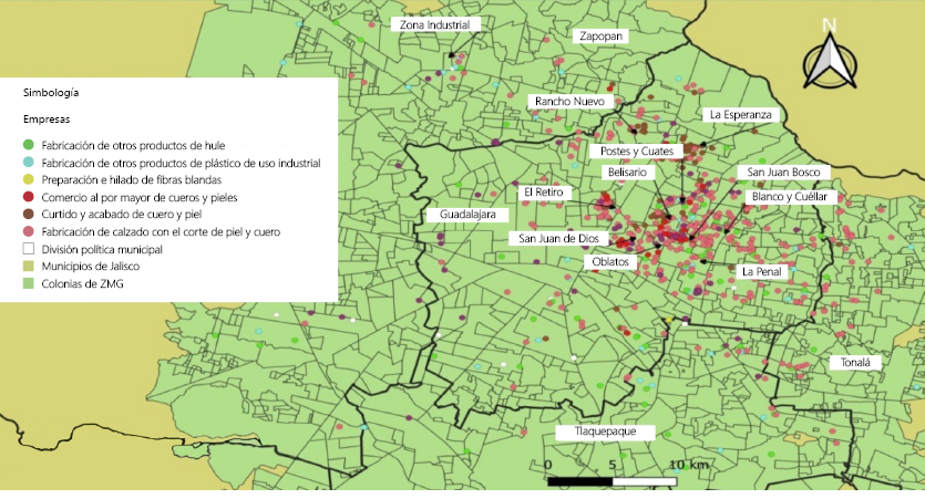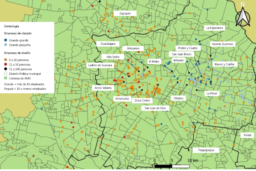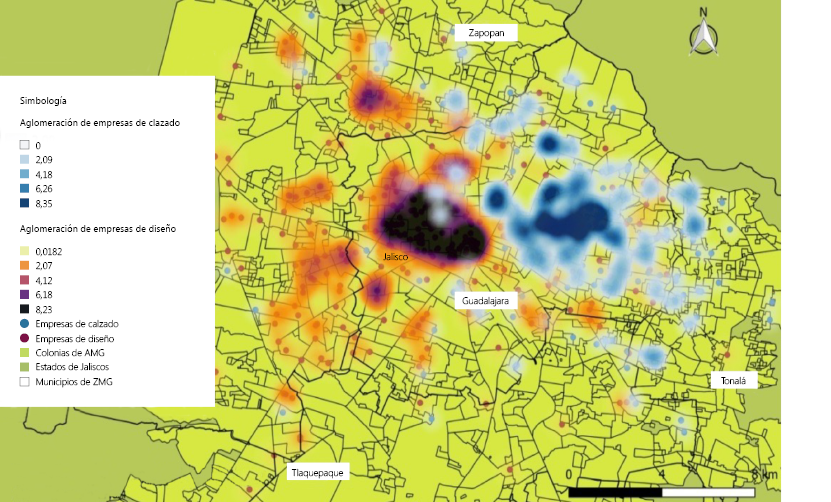 Desde a década de 1990, a indústria de calçados foi afetada pelos processos de abertura econômica associados ao Acordo de Livre Comércio da América do Norte e, posteriormente, pelas crises econômicas (1997 e 2008) e pela pandemia da Covid-19. Em todos os casos conseguiu se recuperar devido a suas raízes, considerando sua localização no município de Guadalajara desde a época colonial, bem como o know-how que permanece no mercado de trabalho e as redes produtivas em sua cadeia de valor. Nessa última, são identificadas aglomerações de empresas de calçados e de design, bem como seus fluxos que podem ser transmitidos como meios de comunicação mais densos, rápidos e baratos. Os benefícios podem ser economias de escala externas (Vázquez, 2005), aumento da competitividade (Porter, 1998) e, portanto, interrupção do declínio da indústria de calçados.