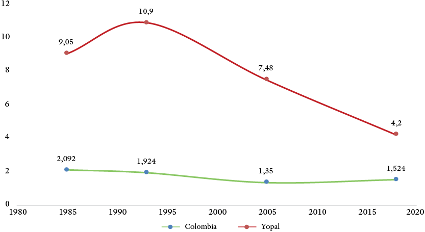 Figura 7. Tasa anual de crecimiento (%) poblacional de Yopal y Colombia en el período 1985-2018