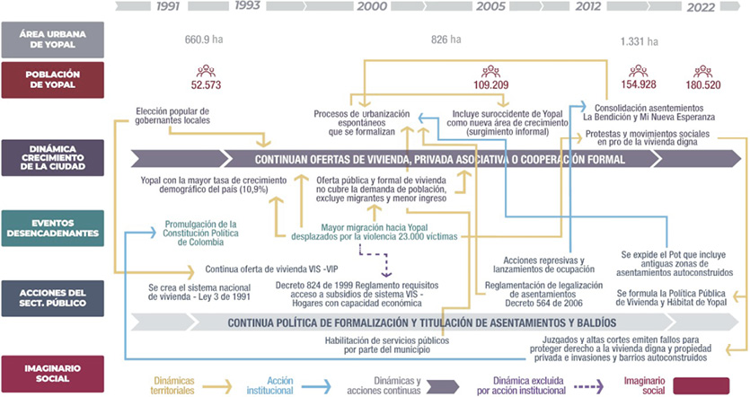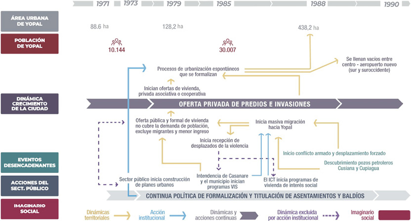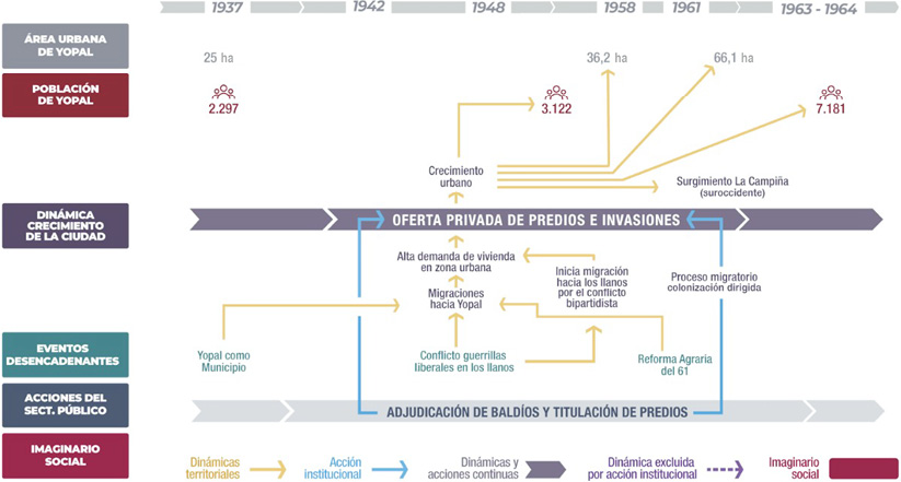 Yopal y su consolidación urbana se explican a partir de las distintas migraciones causadas por asuntos sociales, militares, económicos y políticos de las últimas seis décadas. En especial, son dos los procesos migratorios que determinaron la consolidación urbana del municipio y de la forma de acceso al suelo: i) la migración ocasionada por la estrategia de colonización dirigida en la subregión del piedemonte llanero, siguiendo la reforma agraria de 1961 (Domínguez, 1994); y ii) la migración del boom petrolero (Dureau & Flórez, 2000).